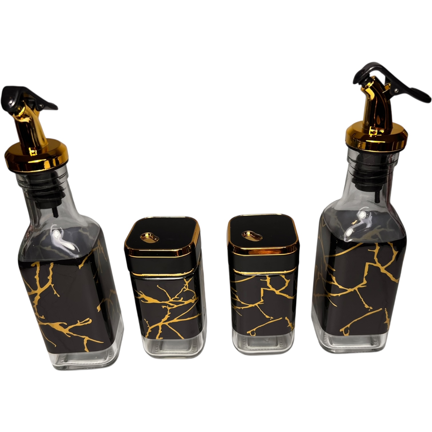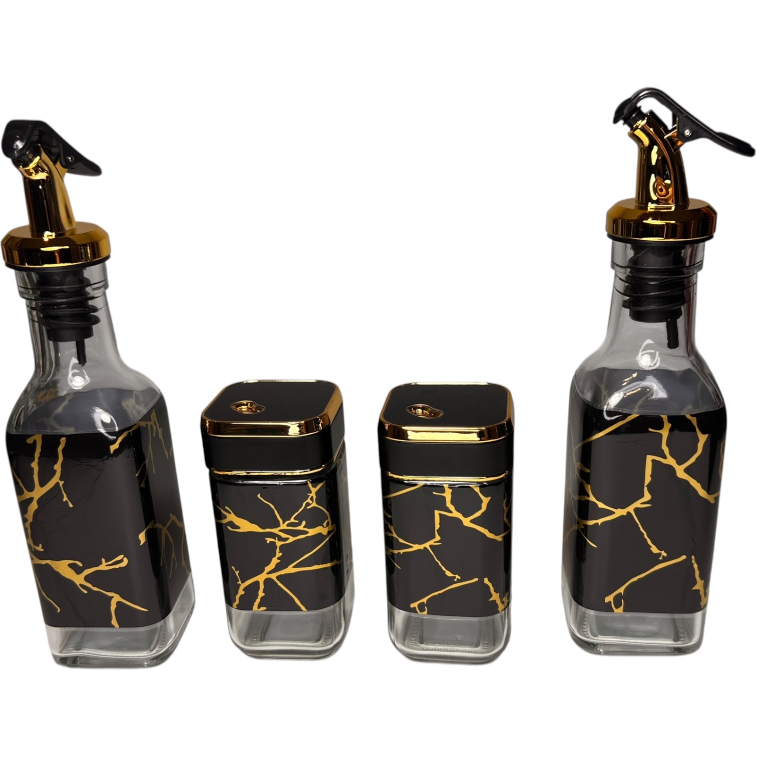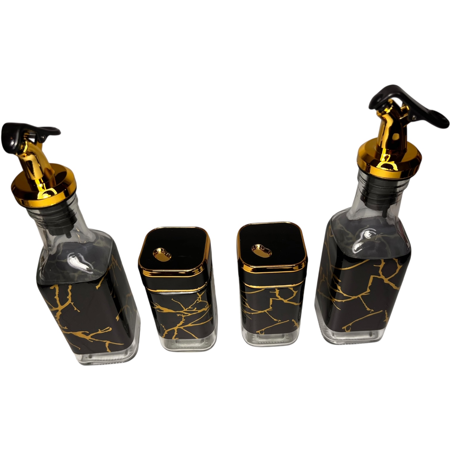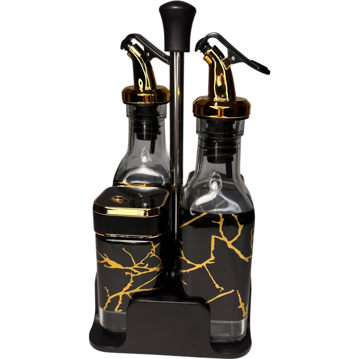 Set de Frascos de Vidrio con Dispensadores y Especieros Mármol Negro y Dorado con Soporte