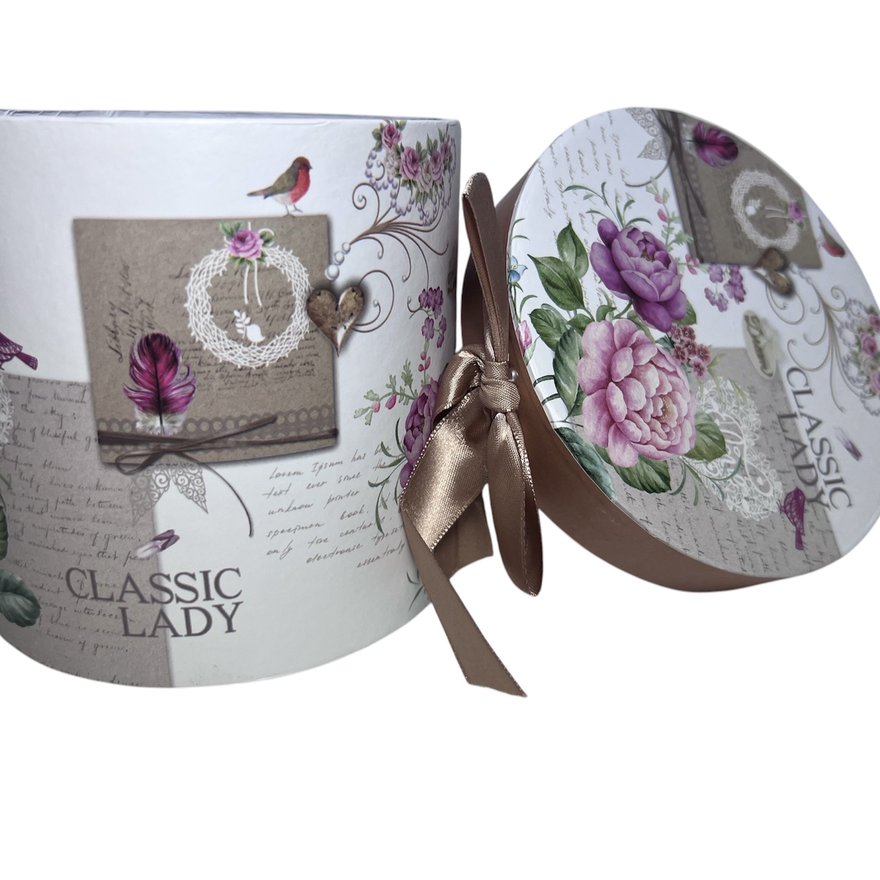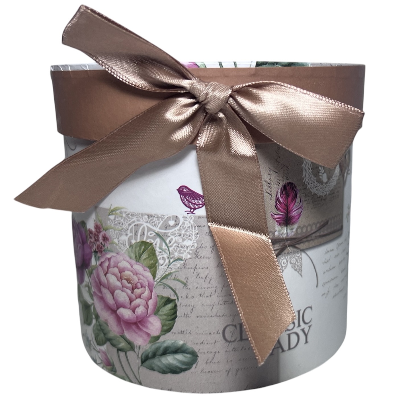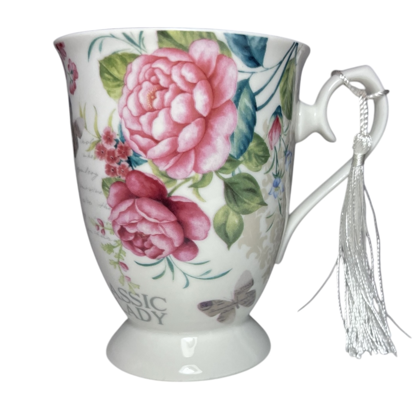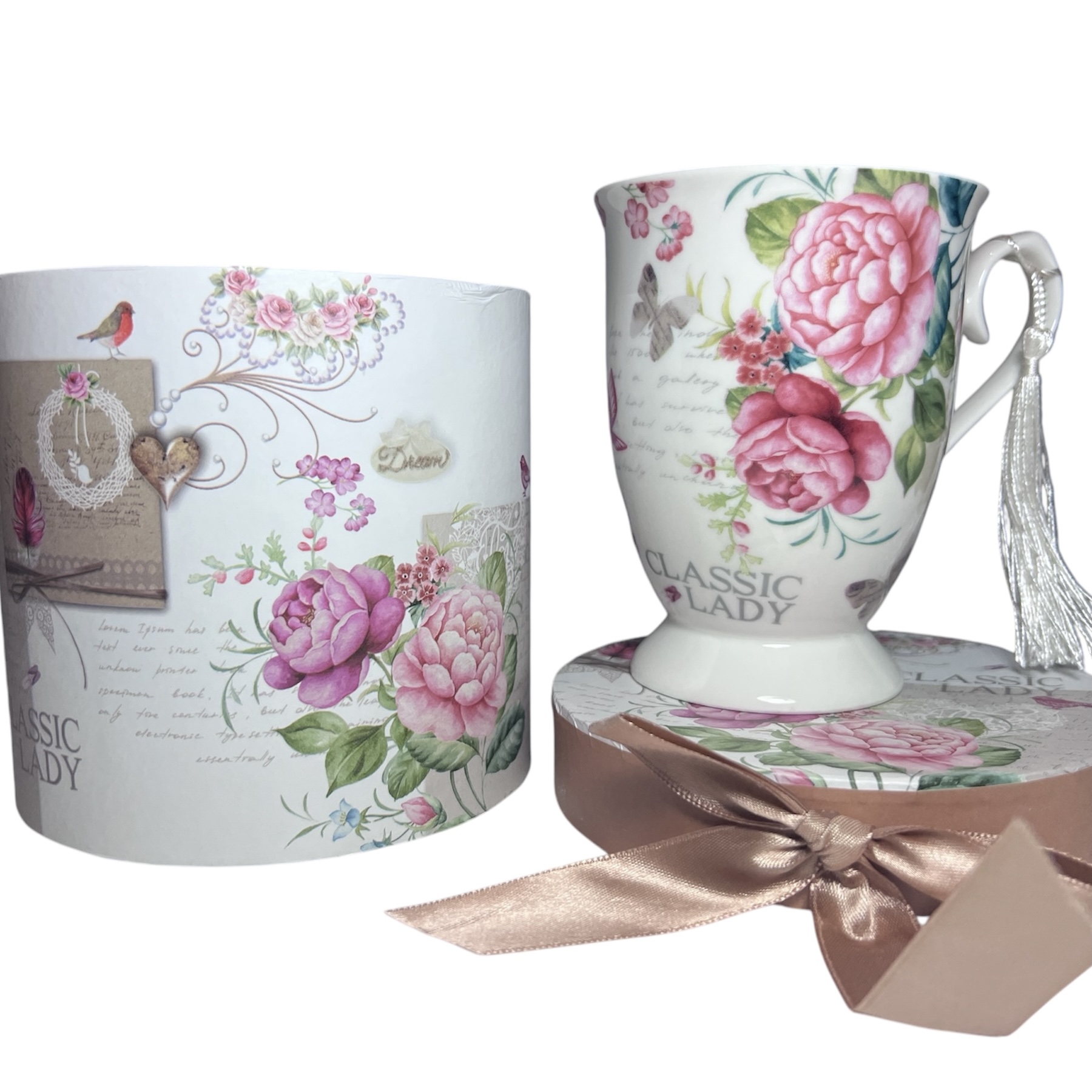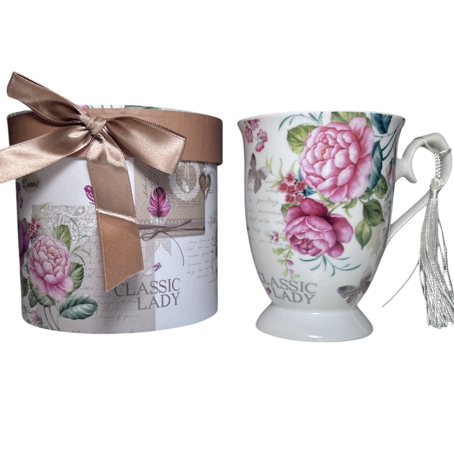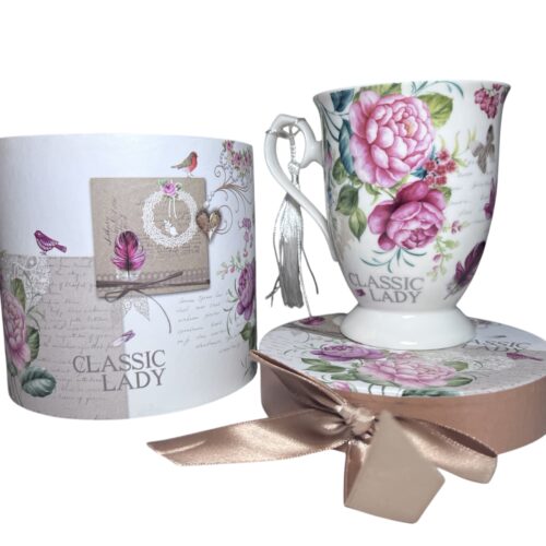 Taza con caja excelente presentación decorada con moño y cucharita de porcelana
