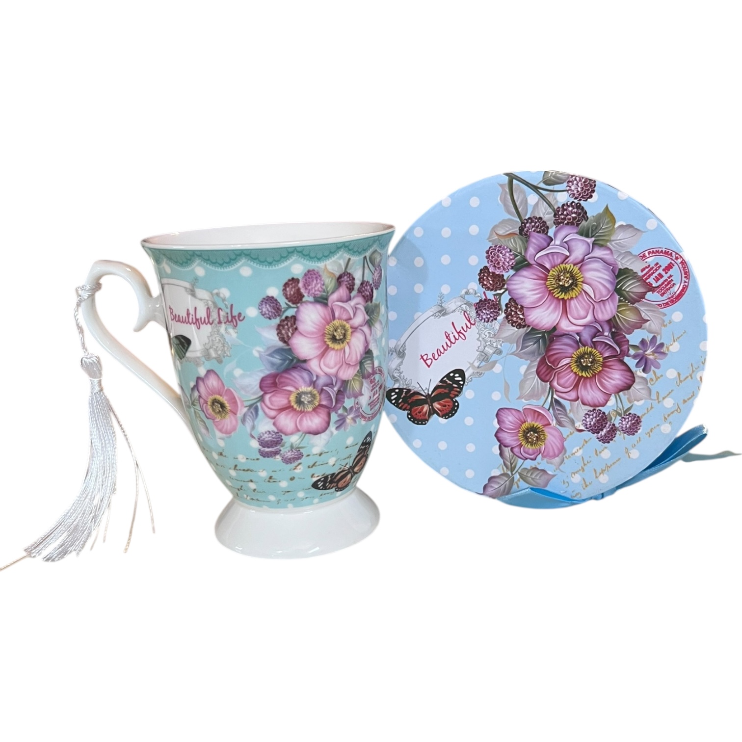 Incluye taza, borla, cuchara y caja excelente presentación.