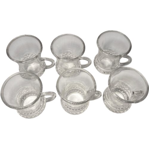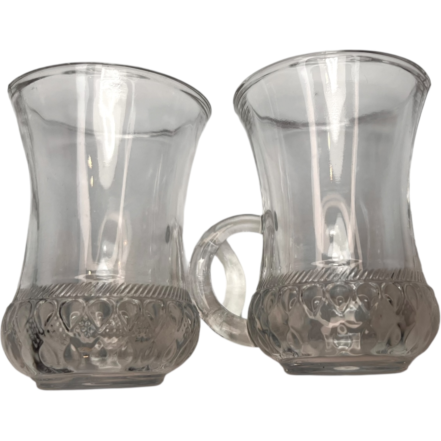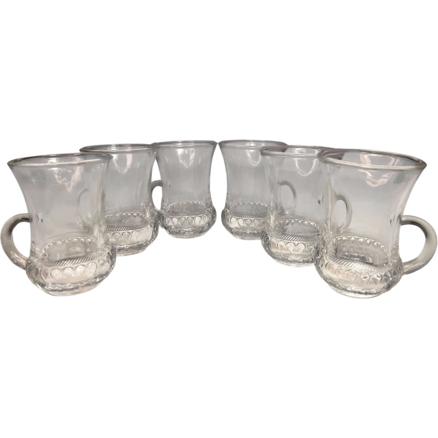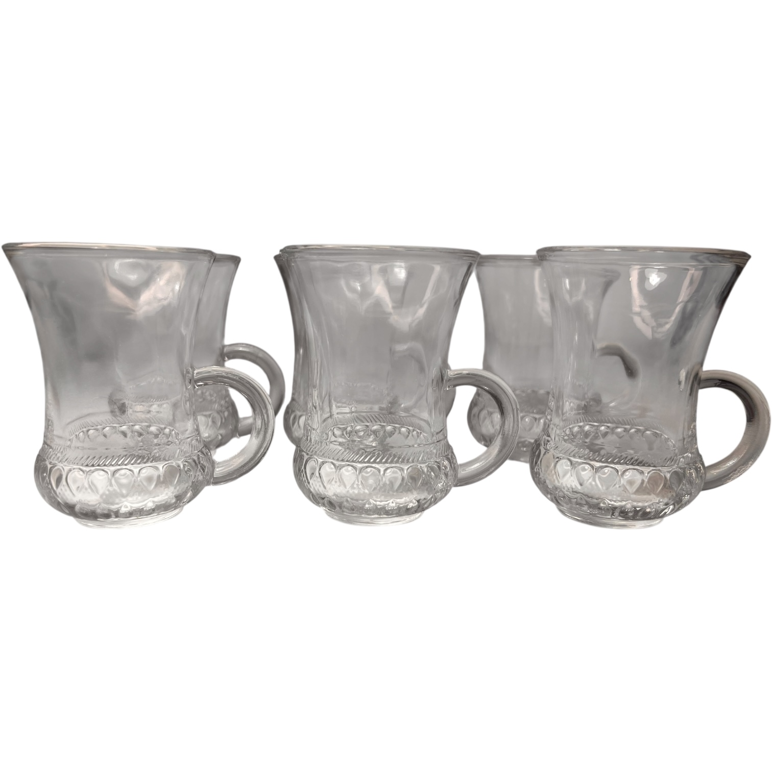 Juego de 6 tazas de vidrio estilo turco con manija. Diseño transparente con base en relieve que realza las bebidas y aporta un toque elegante a la mesa. Ideales para café, té e infusiones.